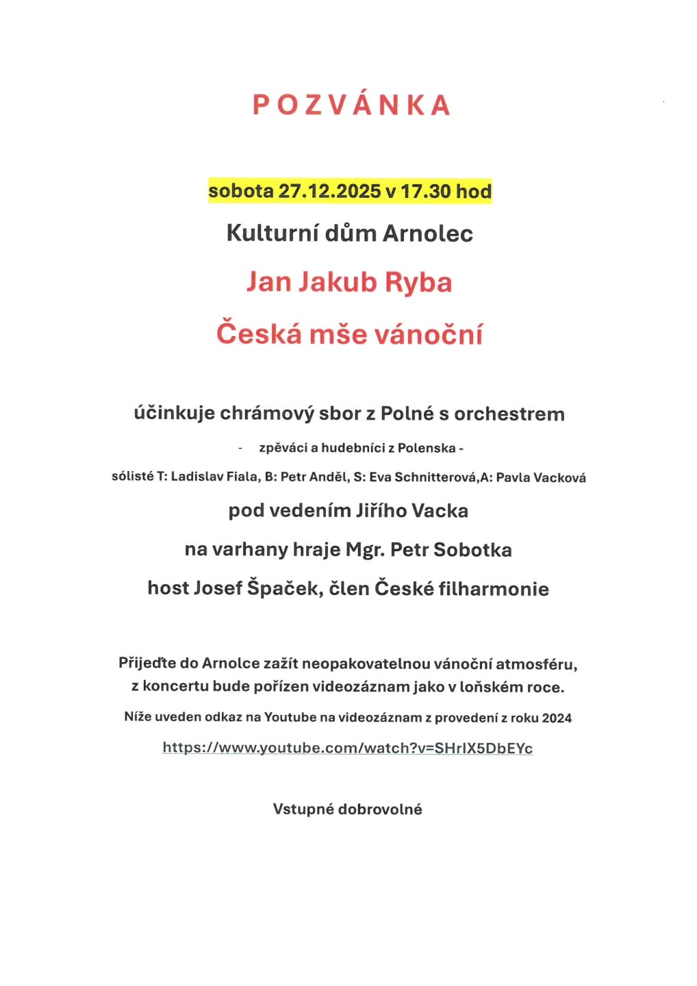 Česká mše vánoční v Arnolci 27.12.2025 v 17:30 hod.