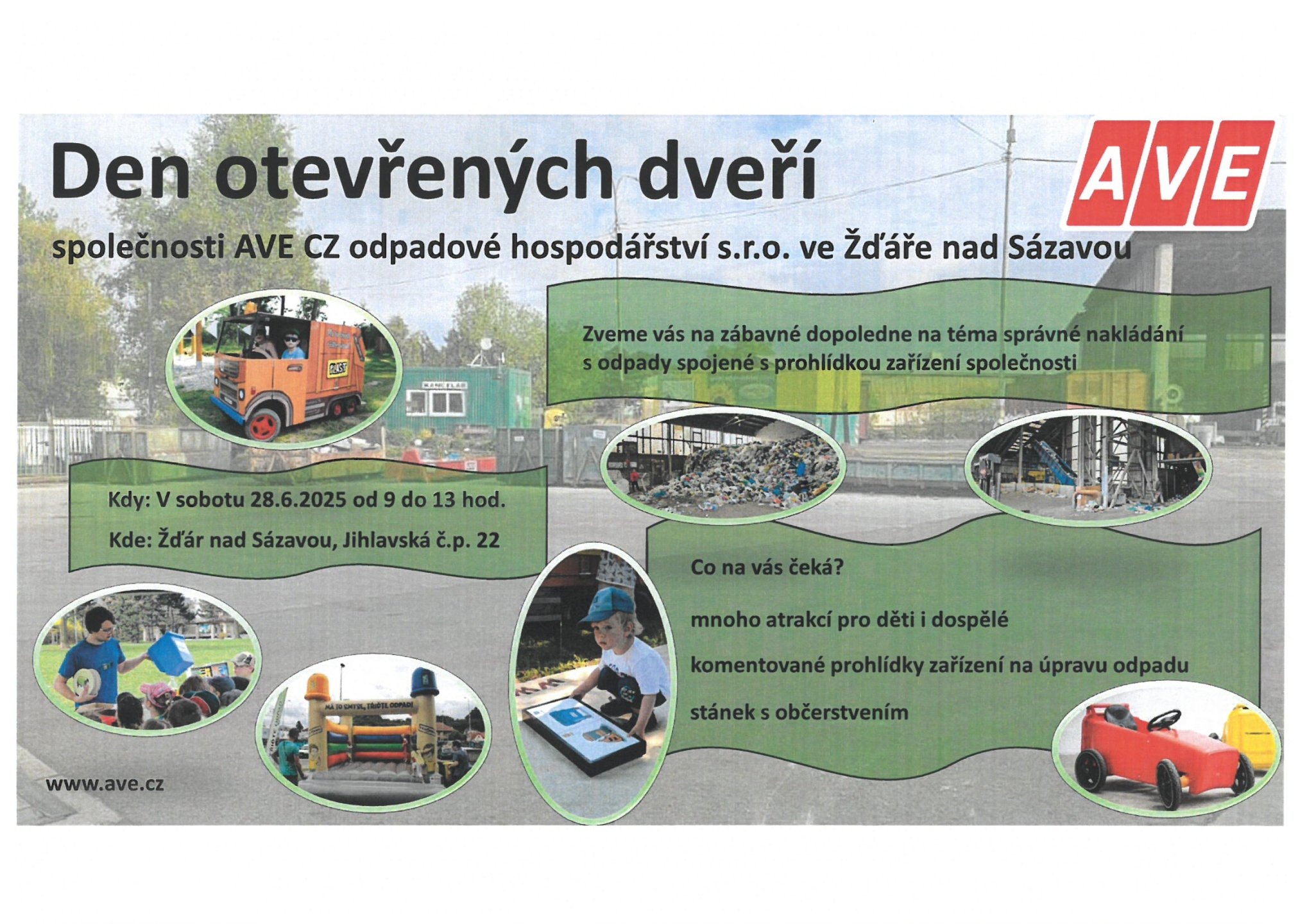 Společnost AVE CZ odpadové hospodářství s.r.o. ve Žďáře nad Sázavou zve občany na den otevřených dveří v sobotu 28.6.2025 od 9 do 13 hod. do Žďáru nad Sázavou, Jihlavská 22. Čeká Vás zábavné dopoledne na téma správné nakládání s odpady spojené s prohlídkou zařízení společnosti.