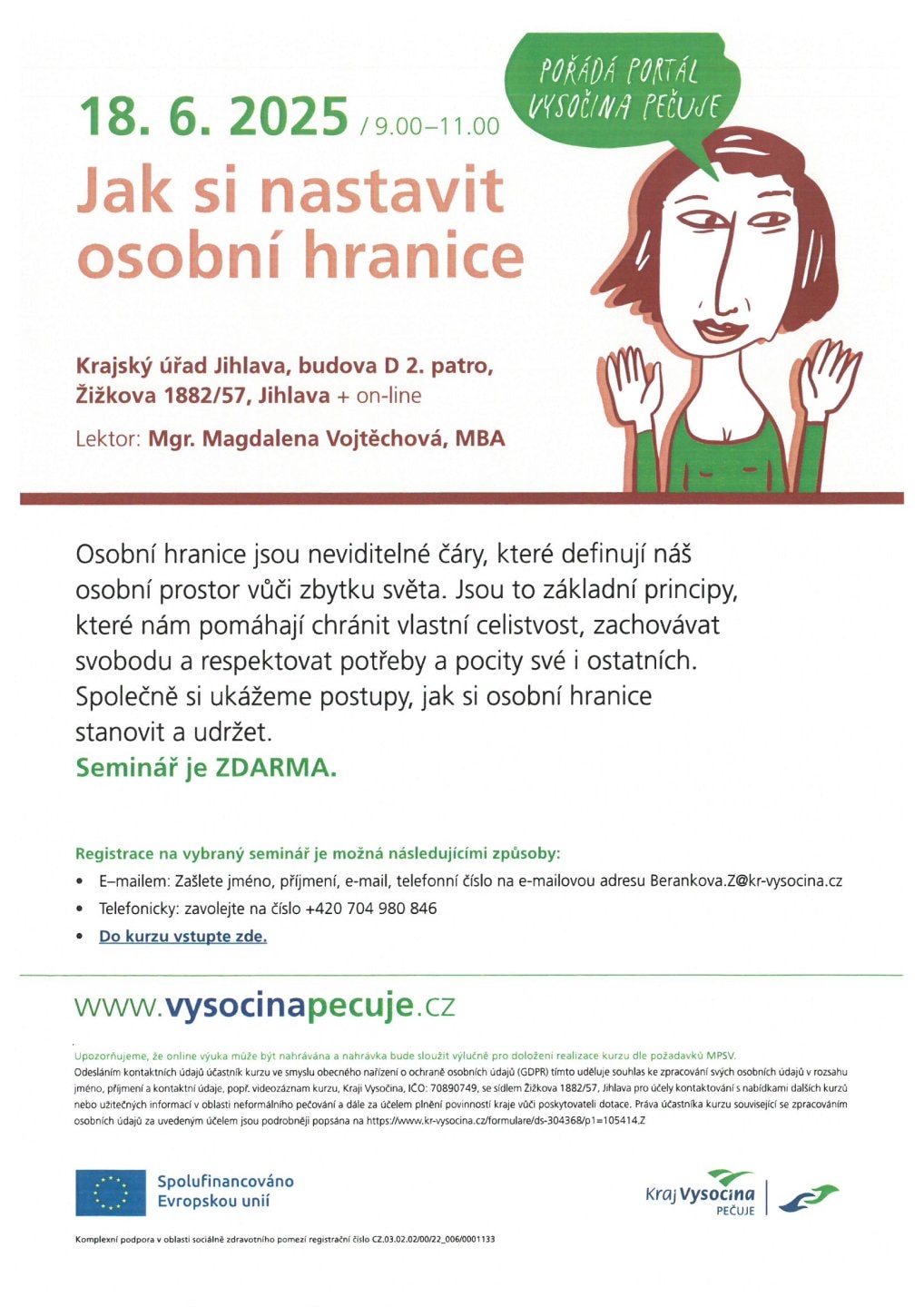 Portál Vysočina pečuje pořádá 18.6.2025 seminář Jak si nastavit osobní hranice. Seminář je zdarma.