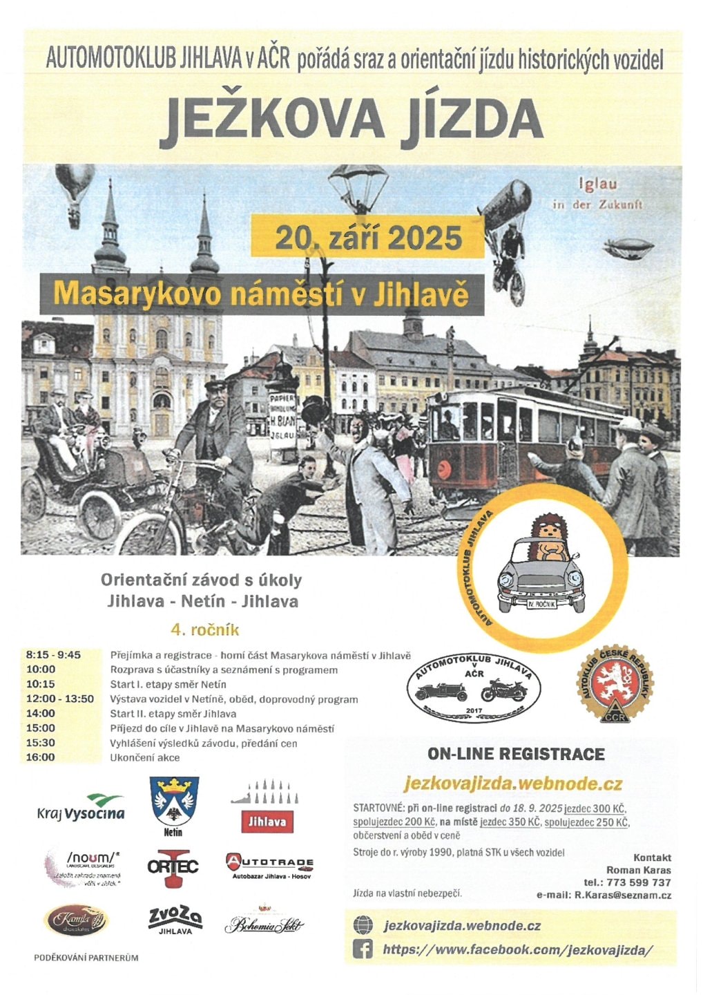 Automotoklub Jihlava v AČR pořádá sraz a orientační jízdu historických vozitel - Ježkova jízda - 20. září z Masarykova náměstí v Jihlavě, směr Netín a zpátky do Jihlavy. Krátká zastávka bude také v Měříně na parkovišti u kostela, kde budou účastníci plnit 4.úkol v čase od 10:45 hod., přibližně 1 hodinu, než projedou všichni účastníci. Při zpáteční jízdě z Netína do Jihlavy budou historická vozidla projíždět přes Měřín asi ve 14 hodin. V přiloženém itineráři trasy najdete bližší informace.