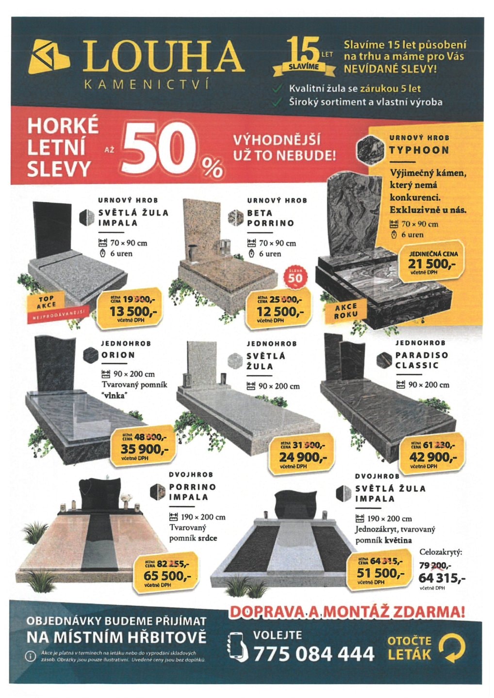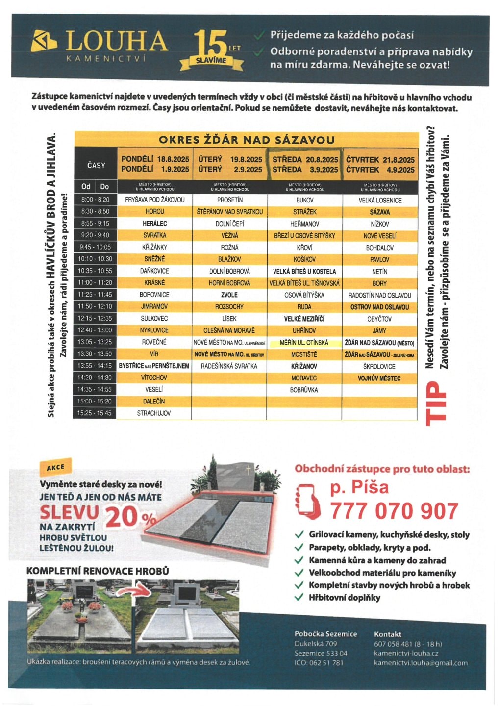 Ve středu 20.8. a ve středu 3.9.2025 přijede na nový hřbitov zástupce Kamenictví Louha. Firma nabízí nové celo-žulové hroby, krycí desky, rovnání pomníků, čištění a renovace terasových hrobů a obnovu písma. Kompletní kamenické práce za velice příznivé ceny- slevy až 35% ! Pokud máte zájem, přijďte ve středu v čase od 13:05 – 13:25 na hřbitov, kde Vám bude k dispozici zástupce Kamenictví Louha.