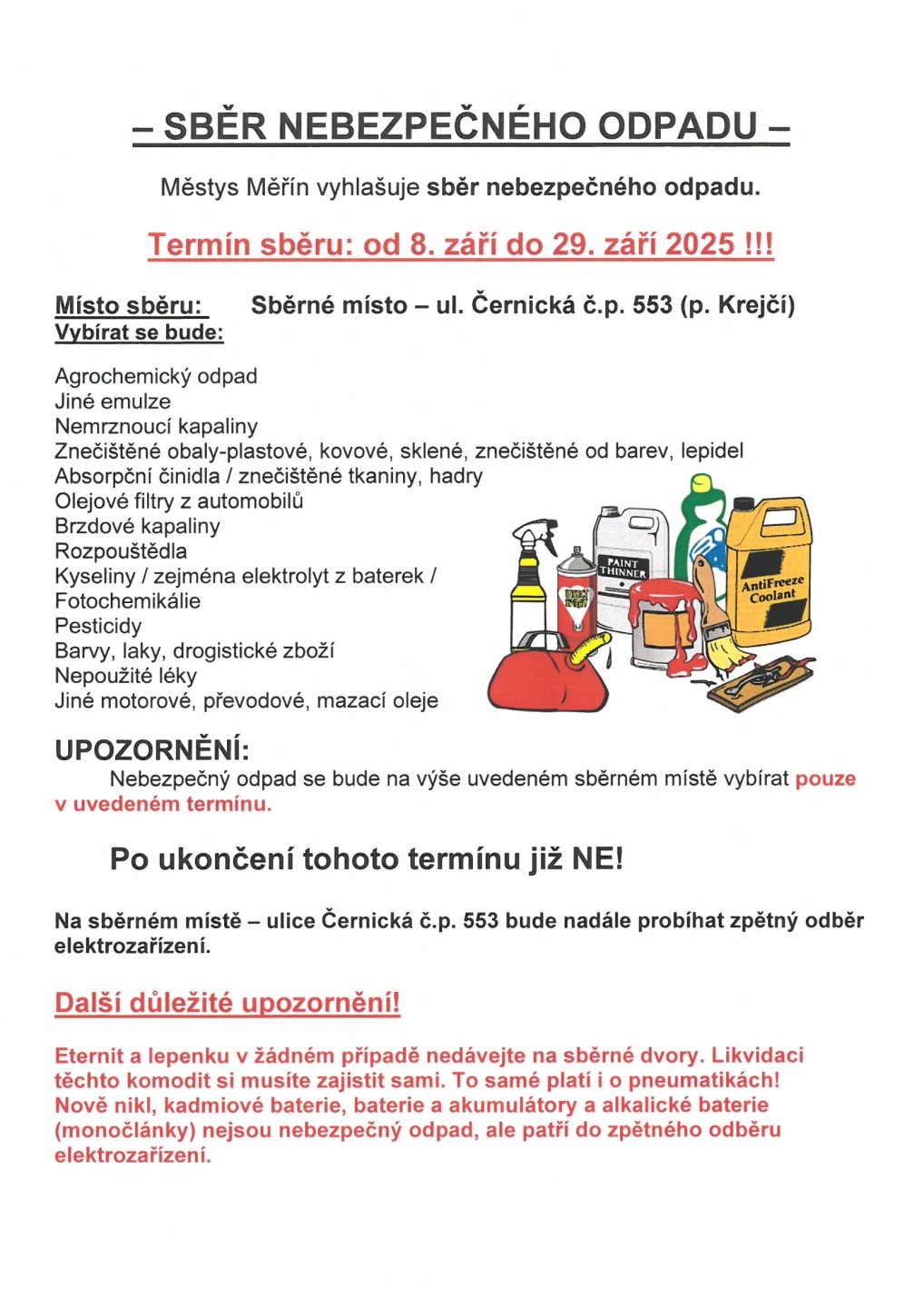 Městys Měřín vyhlašuje sběr nebezpečného odpadu, který proběhne v termínu od 8.9. – 29.9.2025. Sběrné místo je na ulici Černická č.p. 553 u pana Krejčího.