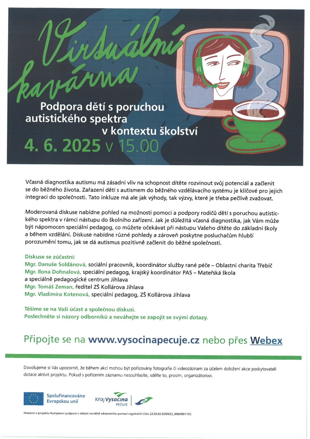 Portál Vysočina pečuje pořádá 4.6.2025 v 15:00 hod Virtuální kavárnu na téma - Podpora dětí s poruchou autistického spektra v kontextu školství.