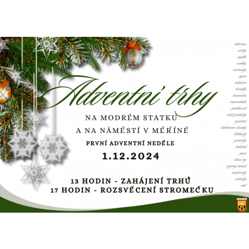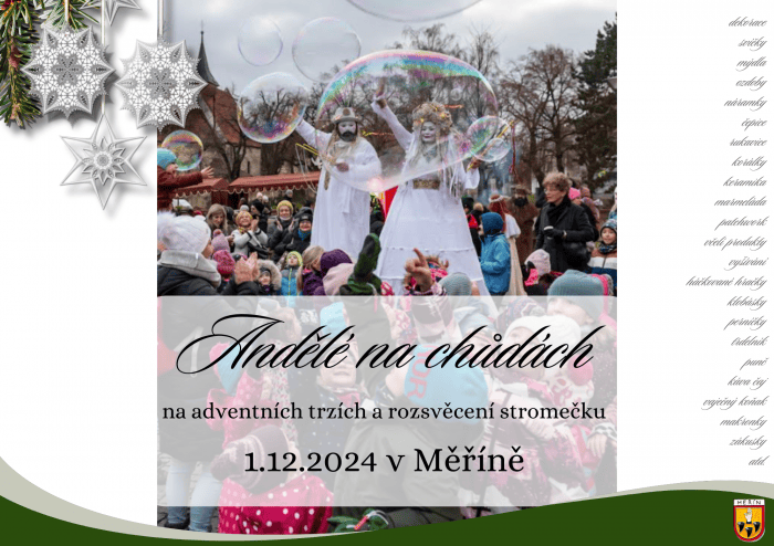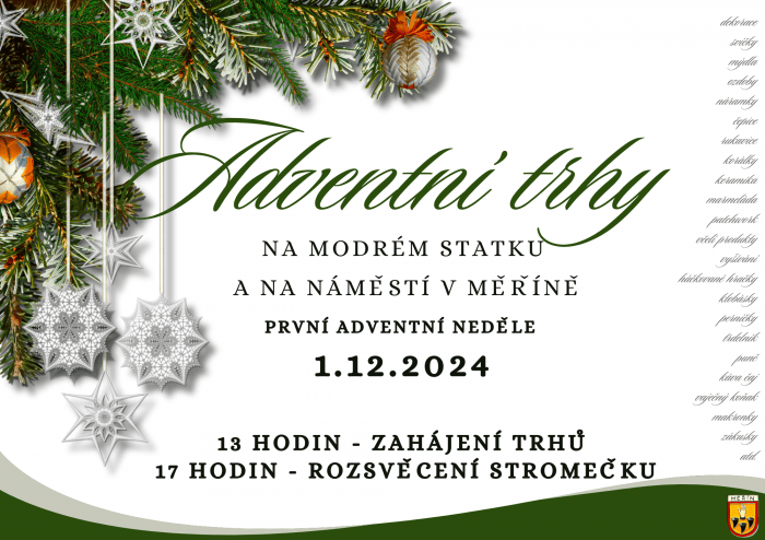 Vánoce se pomalu blíží a advent začíná. Přijďte zažít předvánoční atmosféru na první adventní neděli 1.12.2024. Ve 13 hod. budou zahájeny Adventní trhy na Modrém statku a na náměstí v Měříně, můžete potkat Anděle na chůdách a v 17 hodin bude rozsvěcení stromečku.