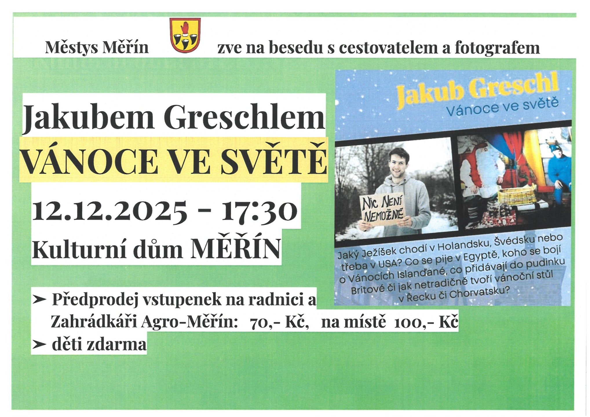 Kulturní komise městyse Měřín Vás zve 12.12. v 17:30 hod. do Kulturního domu v Měříně na besedu s cestovatelem a fotografem Jakubem Greschlem na téma Vánoce ve světě. Předprodej vstupenek je v Zahrádkáři Agra-Měřín a na radnici za 70 Kč, na místě - 100 Kč. Děti do 15 let mají vstup zdarma.
