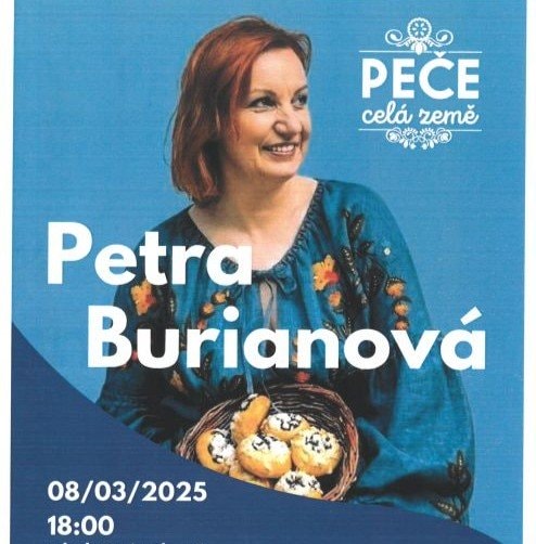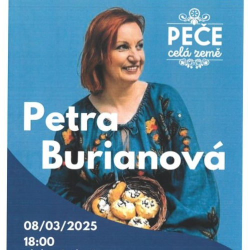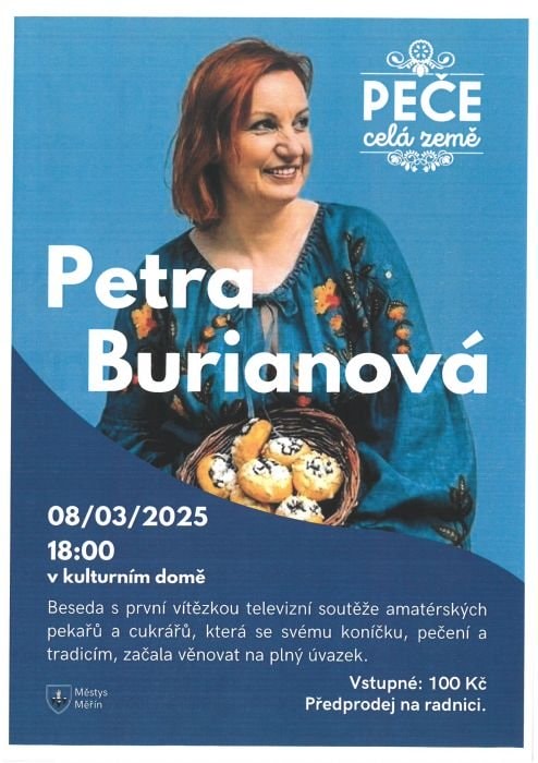 Kulturní komise městyse Měřín zve na besedu s paní Petrou Burianovou, vítězkou talentové TV soutěže "Peče celá země". Beseda proběhne 8.3.2025 v 18:00 hod. v Kulturním domě v Měříně.
