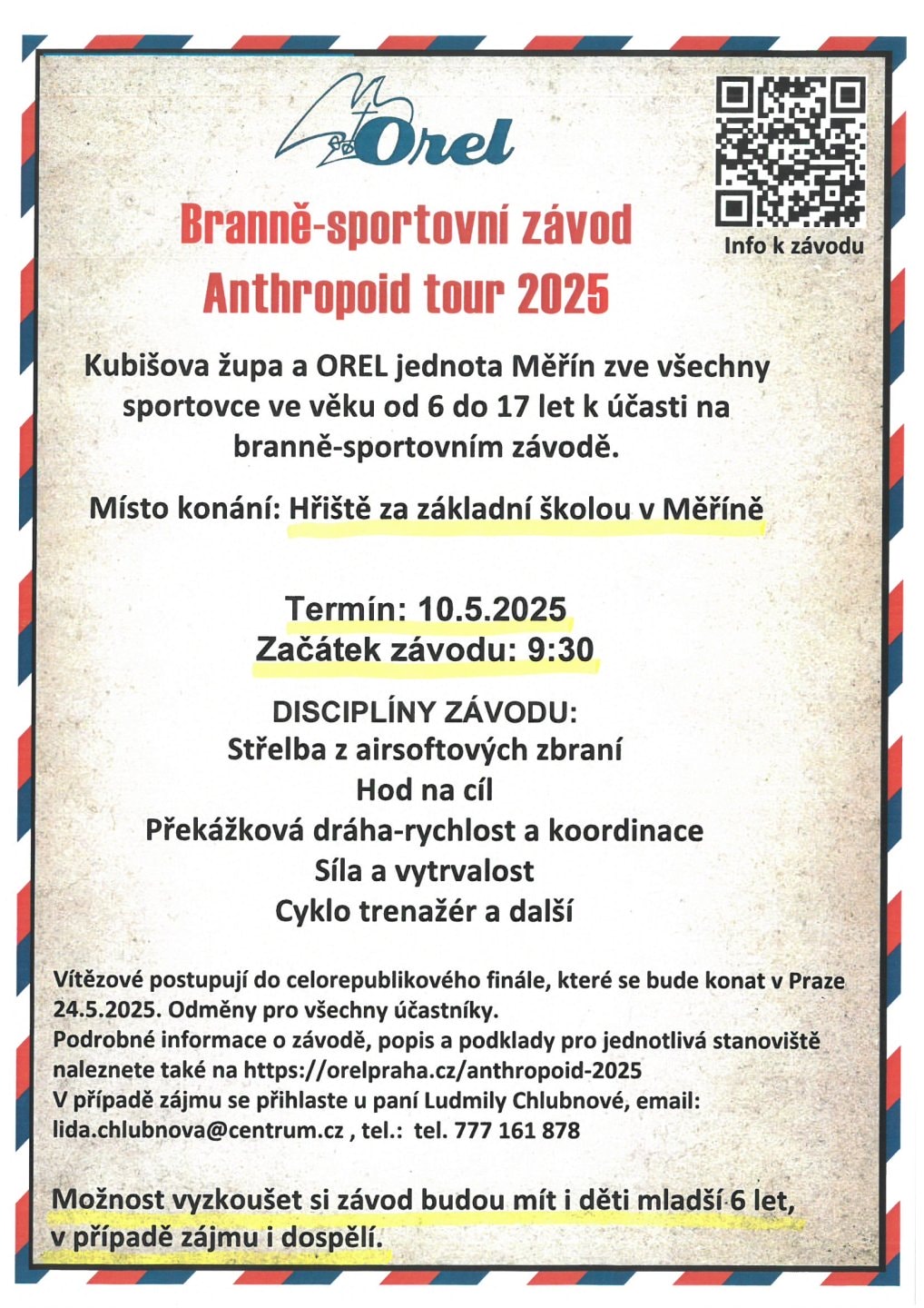 Kubišova župa a OREL jednota Měřín zve všechny sportovce ve věku od 6 - 17 let k účasti na branně-sportovním závodu Anthropoid tour 2025, který se uskuteční 10.5.2025 od 9:30 hod na hřišti za ZŠ v Měříně.