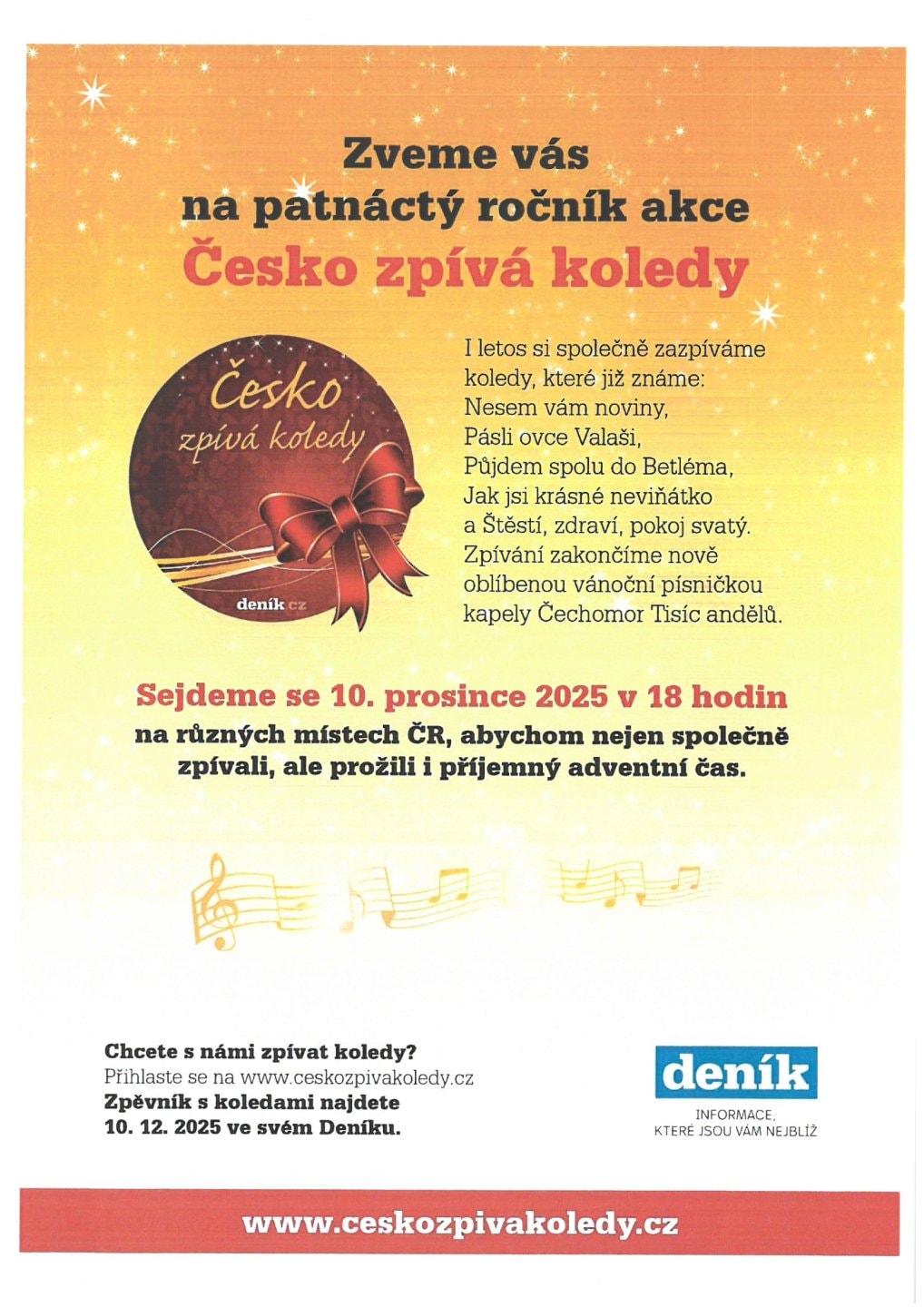 Přijměte pozvání na již 15. ročník této akce, kdy se sejdeme na různých místech ČR, abychom nejen společně zpívali, ale i prožili příjemný adventní čas.