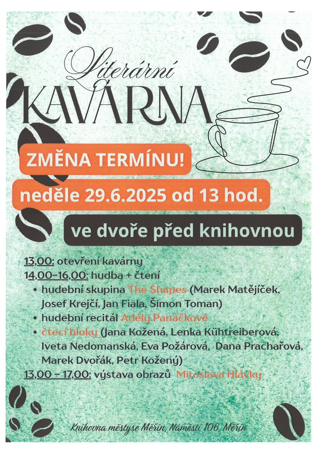 Knihovna městyse Měřín Vás srdečně zve 29.6.2025 od 13 hod. na Literární kavárnu ve dvoře před knihovnou.