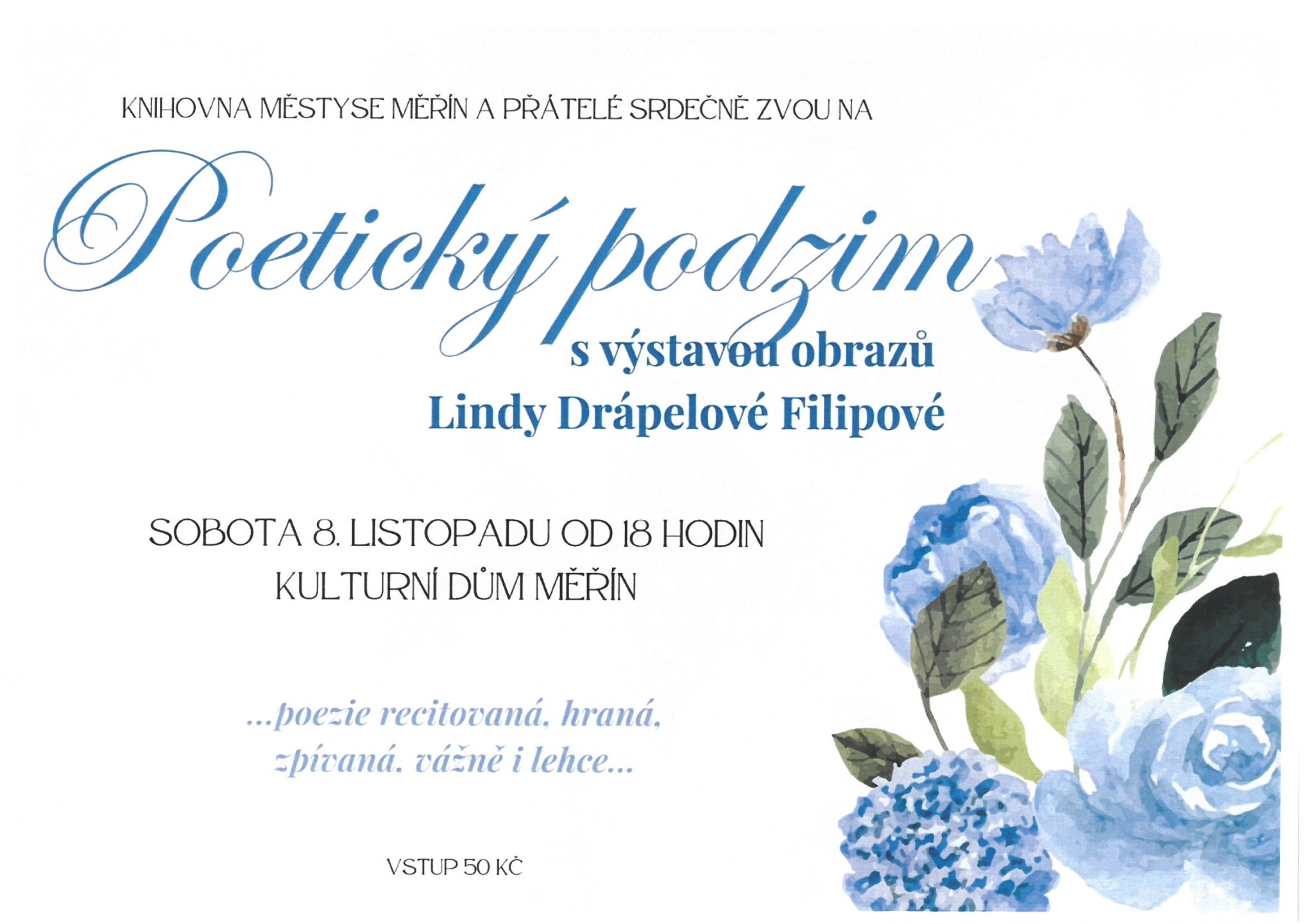 Knihovna městyse Měřín a přátelé srdečně zvou v sobotu 8.11. od 18 hod. do Kulturního domu v Měříně na hudební recitál Petra Koženého a recitace poezie v podání místních nadšenců. Poezii vážnou i nevážnou vám přednesou: Luboš Cejnek, Marek Dvořák, Ivo Horák, Jana Kožená, Lenka Kühtreiberová, Iveta Nedomanská, Eva Požárová a Dana Prachařová. Poslech zpříjemní pohled na obrazy Lindy Drápelové Filipové, její výstava bude prodejní.