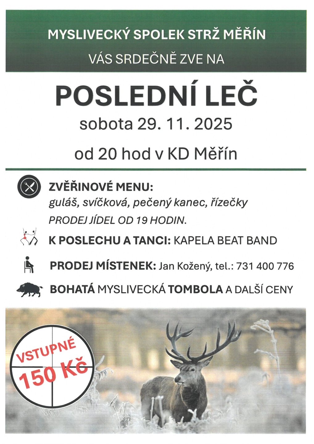Myslivecký spolek STRŽ Měřín pořádá 29.11.2025 od 20:00 hod. Poslední leč v Kulturním domě Měřín. Čeká na Vás zvěřinové menu (guláš, svíčková, pečený kanec, řízečky) - prodej jídel od 19:00 hod. Dále bohatá myslivecká tombola a další ceny. K poslechu a tanci hraje kapela Beat Band. Prodej místenek u Jana Koženého, tel.: 731 400 776.