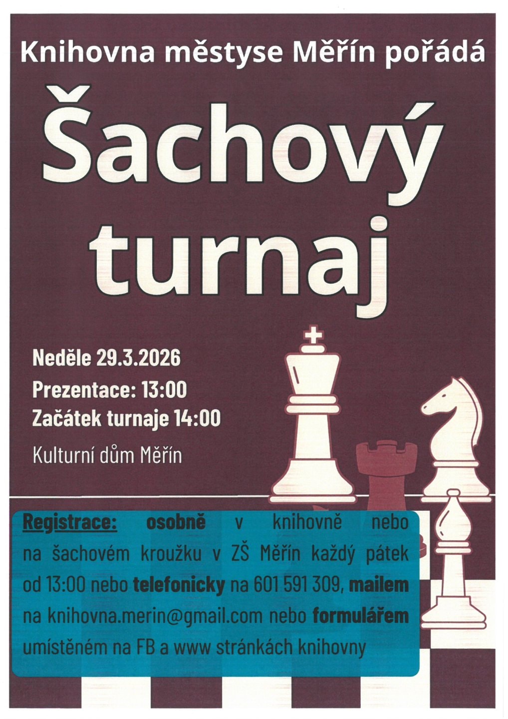 Knihovna městyse Měřín pořádá opět po roce v neděli 29.3.2026 od 13:00 hod. v Kulturním domě v Měříně Šachový turnaj.