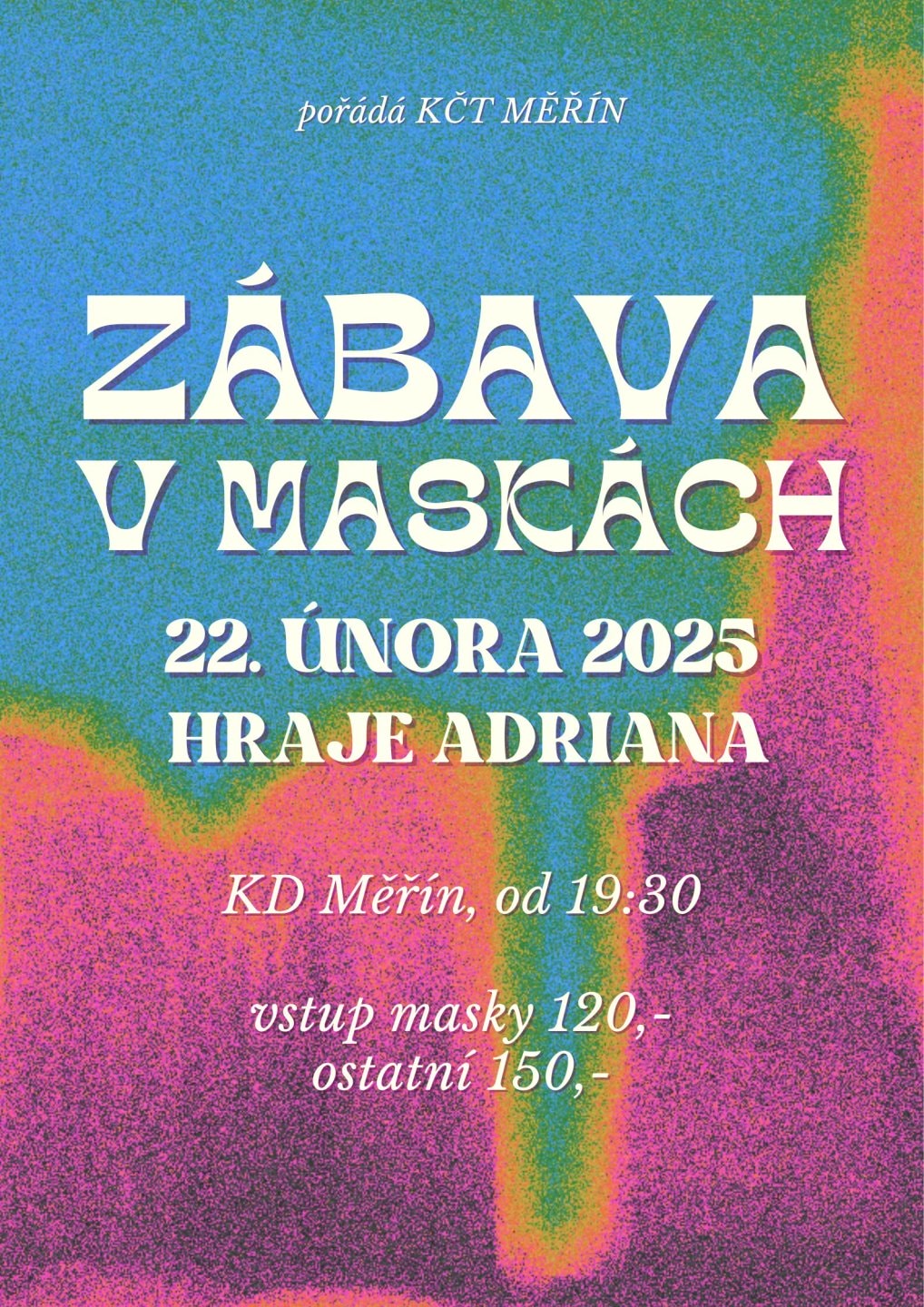 Dne 22.2.2025 od 19:30 hod. se můžete těšit na tradiční Šibřinky, které pořádá Klub českých turistů v Kulturním domě Měřín. Hraje skupina Adriana. Vstup masky 120,- Kč, ostatní 150,- Kč.