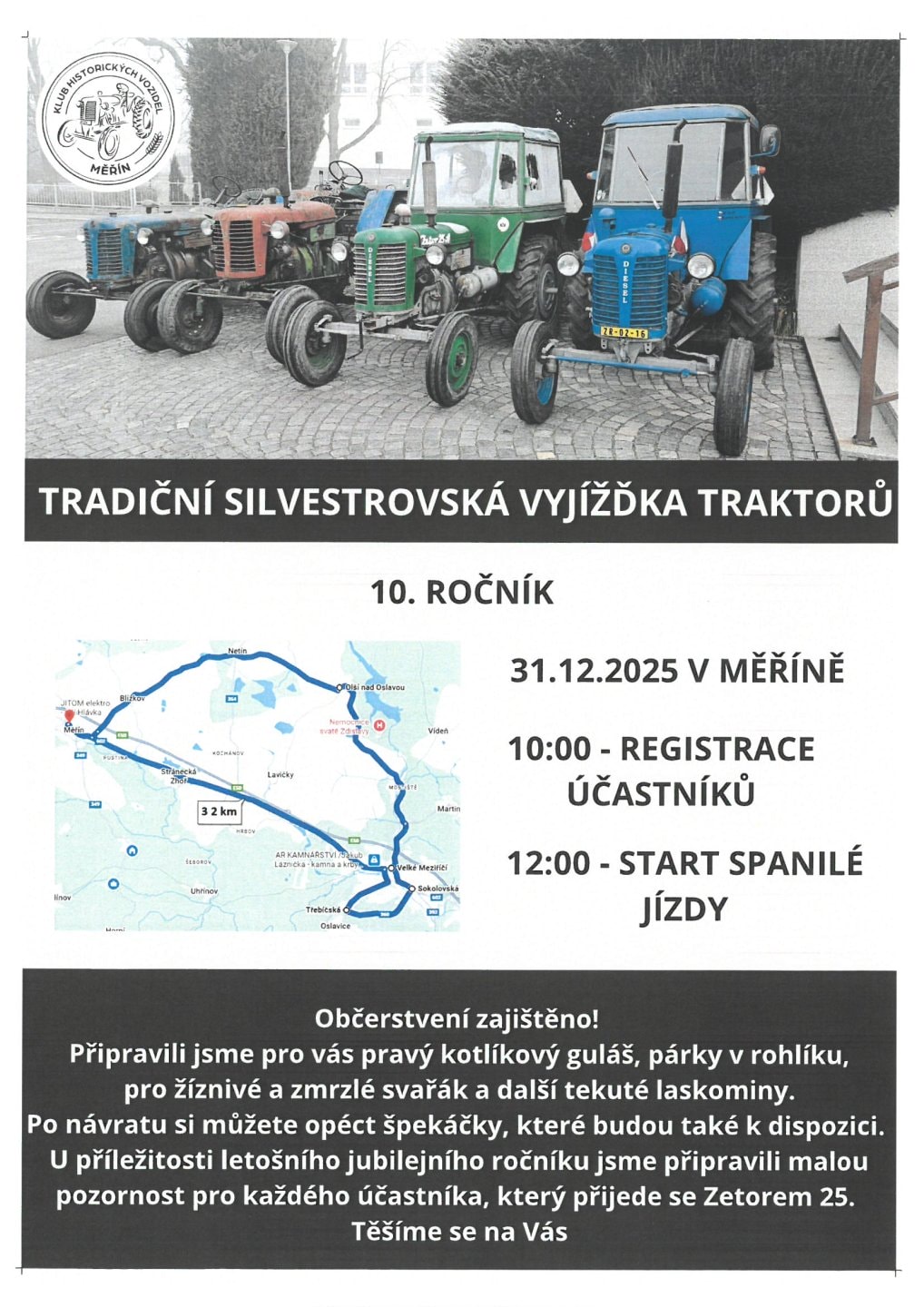 Silvestrovskou vyjížďku traktorů pořádá Klub historických vozidel Měřín dne 31.12.2025 v Měříně. Registrace účastníků v 10:00 hod. a start spanilé jízdy ve 12:00 hod. Občerstvení zajištěno.