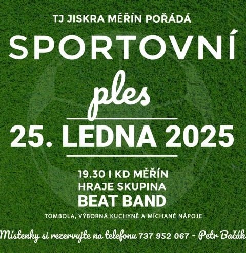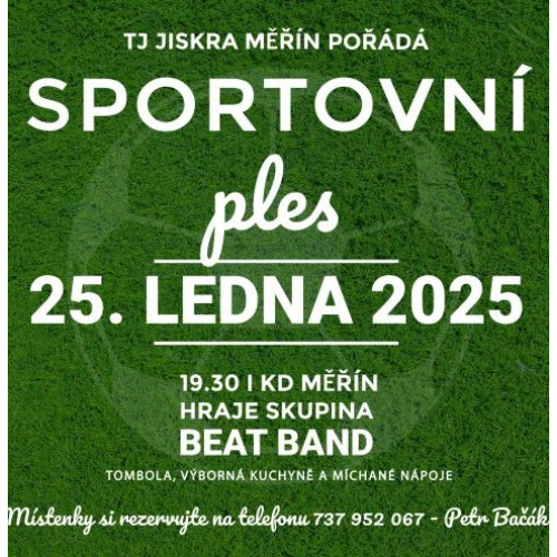 TJ Jiskra Měřín pořádá 25.1. v Kulturním domě v Měříně Sportovní ples. Hraje skupina Beat Band. Nebude chybět bohatá tombola, výborná kuchyně a míchané nápoje. Místenky si rezervujte na tel. 737 952 067. Těší se na Vás pořadtelé.