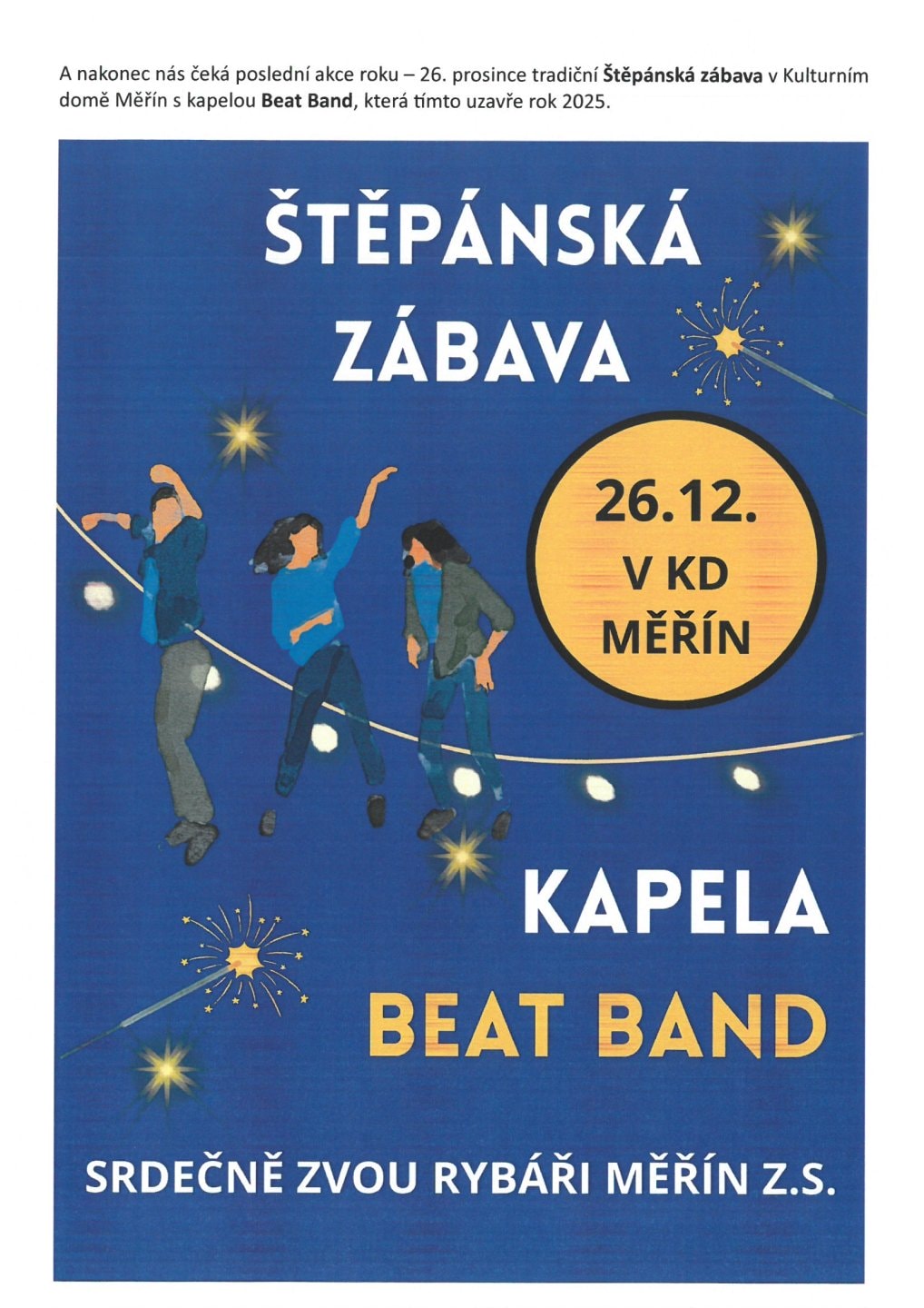 Rybáři Měřín srdečně zvou na tradiční Štěpánskou zábavu 26.12.2025 do Kulturního domu v Měříně.