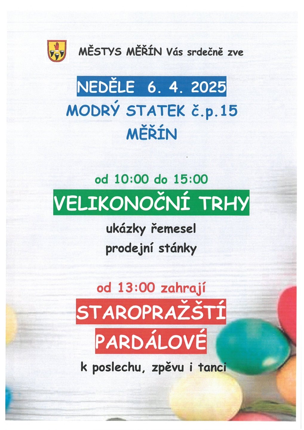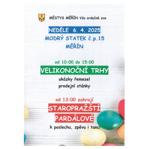 Městys Měřín Vás srdečně zve 6.4.2025 od 10:00 do 15:00 hod. na Velikonoční trhy v Měříně na modrém statku č. 15. Od 13:00 hod. k poslechu a tanci zahrají Staropražští Pardálové.