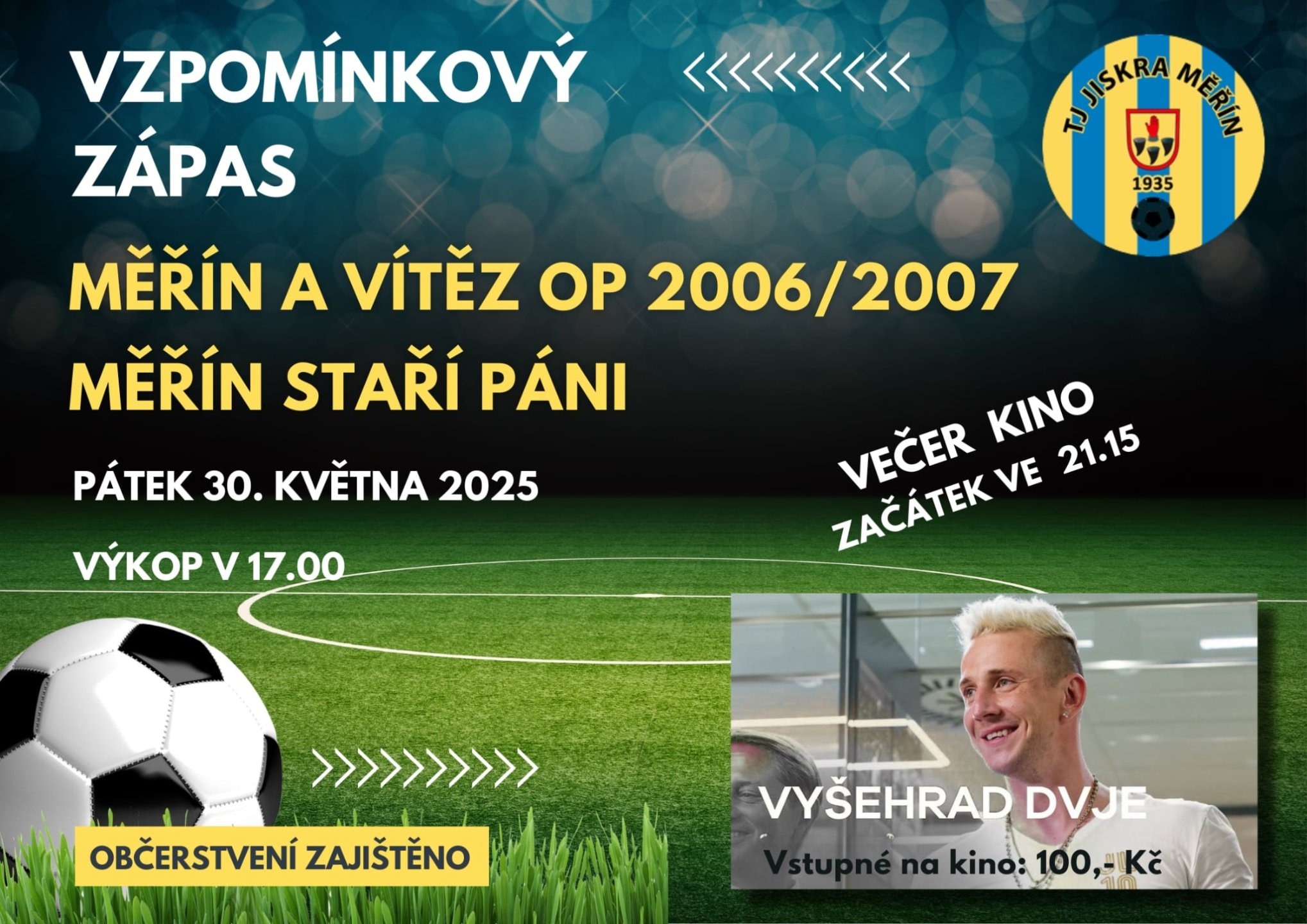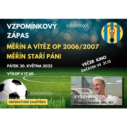 TJ Jiskra Měřín pořádá Vzpomínkový zápas v pátek 30.5., výkop v 17:00 hod. Večer ve 21:15 hod. se bude promítat kino Vyšehrad Dvje.