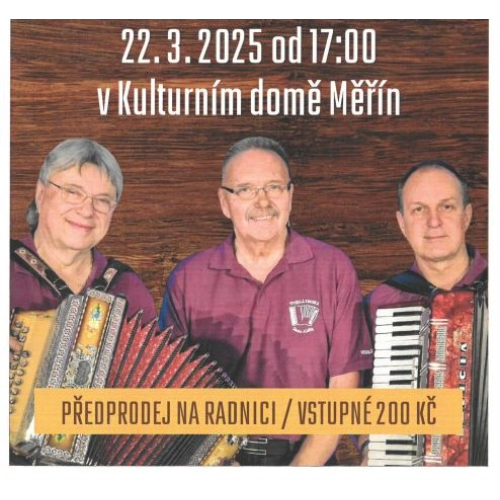 Kulturní komise městyse Měřín pořádá 22.3.2025 v 17:00 hod. koncert Veselé Trojky.
