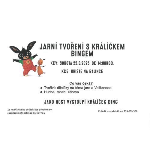 Ivona Mutlová pro Vás připravila Jarní tvoření s králíčkem bingem v sobotu 22.3.2025 od 14:00 hod. na hřišti na Balince. Čekají Vás tvořivé dílničky…