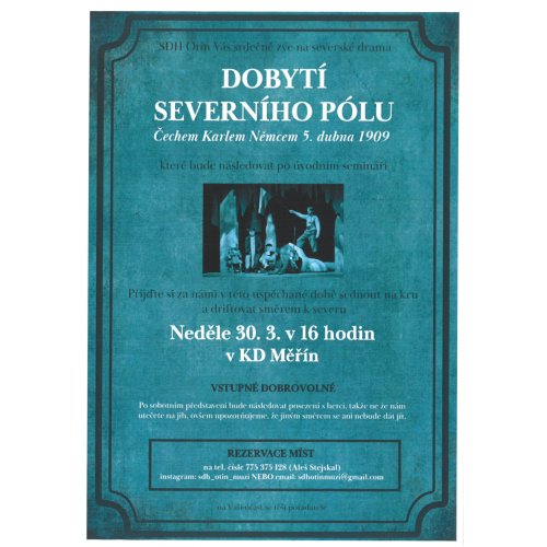SDH Otín Vás srdečně zve v neděli 30.3. v 16:00 hod do Kulturního domu v Měříně na severské drama Dobytí severního pólu Čechem Karlem Němcem 5. dubna…