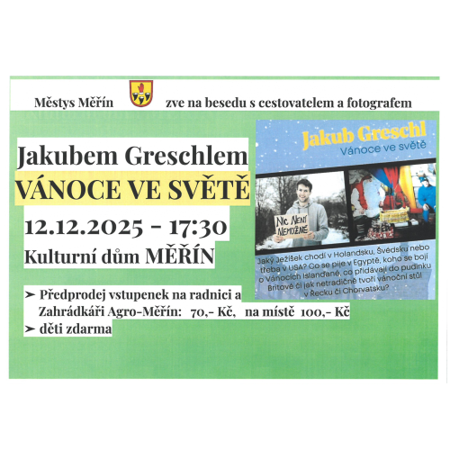 Kulturní komise městyse Měřín Vás zve 12.12. v 17:30 hod. do Kulturního domu v Měříně na besedu s cestovatelem a fotografem Jakubem Greschlem na téma…