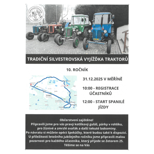 Silvestrovskou vyjížďku traktorů pořádá Klub historických vozidel Měřín dne 31.12.2025 v Měříně. Registrace účastníků v 10:00 hod. a start spanilé…